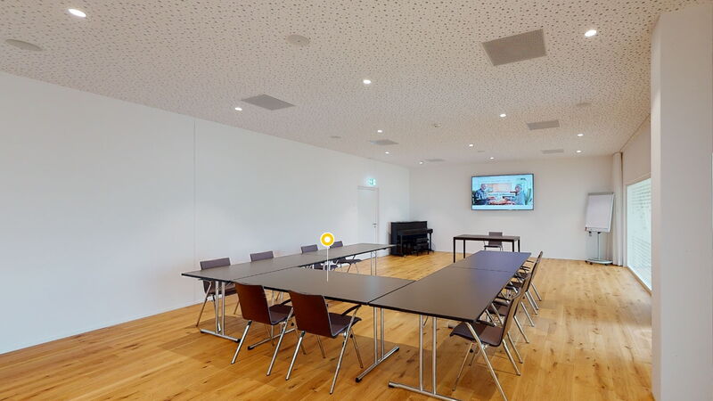 Entdecken Sie unsere Veranstaltungs- und Seminarräume "Aula" und "Hermikon" im 3D-Rundgang. Durch anklicken der eingezeichneten weissen Kreise am Boden können Sie sich durch den Raum bewegen und erhalten einen Eindruck der Räumlichkeiten. Durch Halten der linken Maustaste und bewegen der Maus ist von jedem Standpunkt eine 360°-Ansicht möglich.