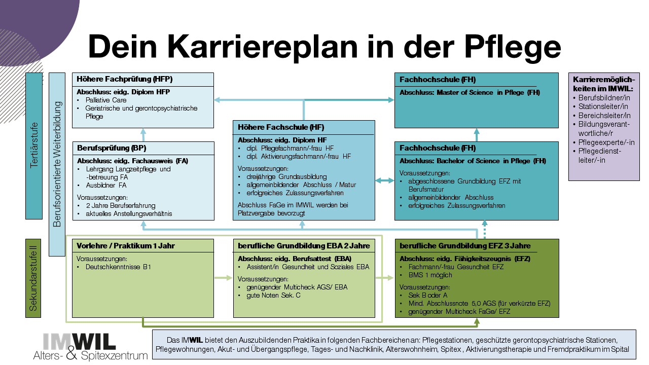Eine Ausbildung oder Weiterbildung im IMWIL Alters- und Spitexzentrum bietet Dir die Möglichkeit, fachlich zu wachsen, persönlich zu reifen und echte Teamarbeit auf Augenhöhe zu erleben. Du lernst, Verantwortung zu übernehmen, Fachwissen anzuwenden und mit Empathie zu handeln – in einem Umfeld, das Dich fördert und wertschätzt.