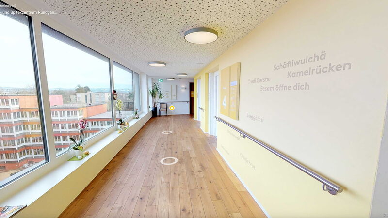 Bewegen Sie sich auf unserem 3D-Rundgang durch eine unserer Pflegestationen im Haus D.
